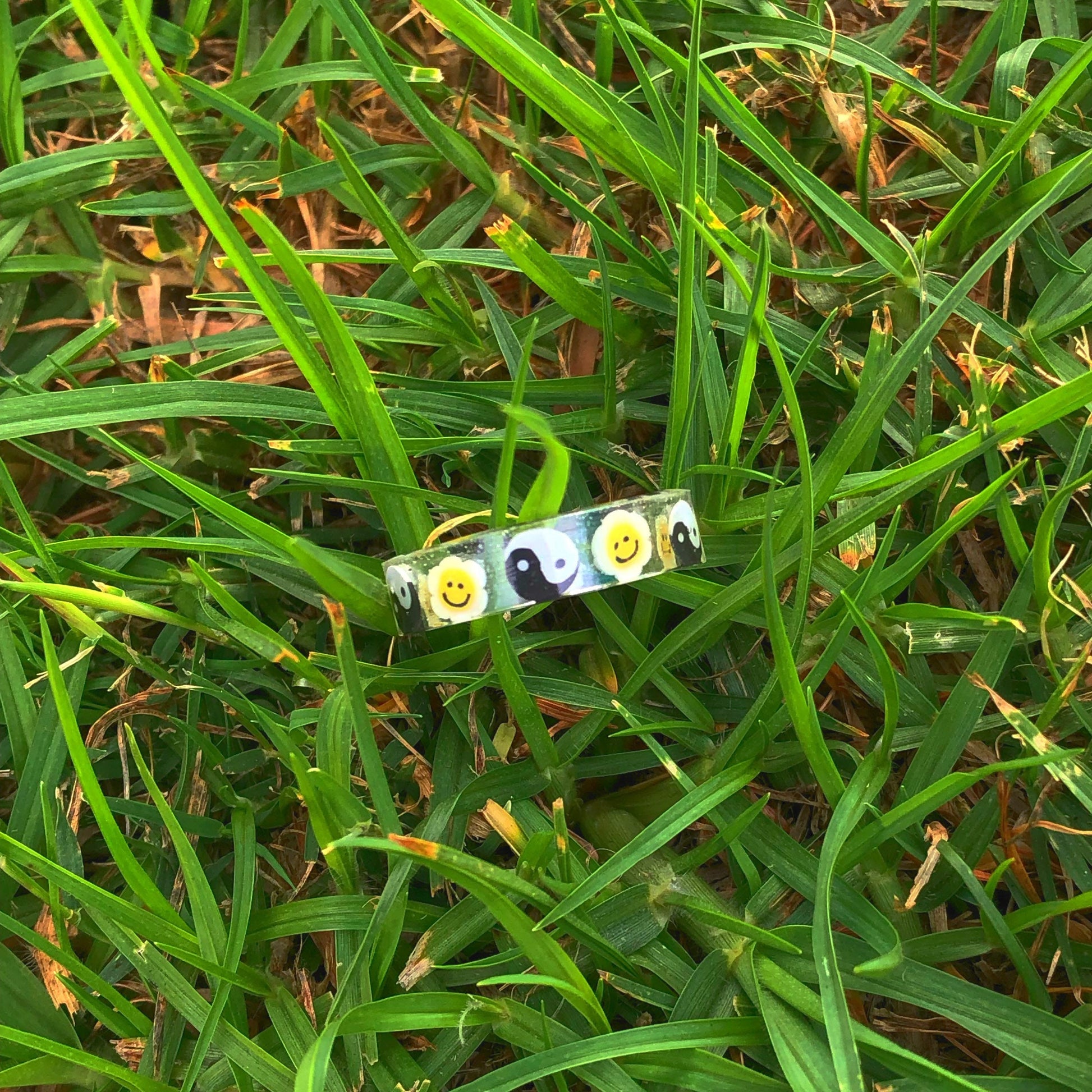 Handmade resin ring featuring polymer clay yin and yang and smiley face flowers